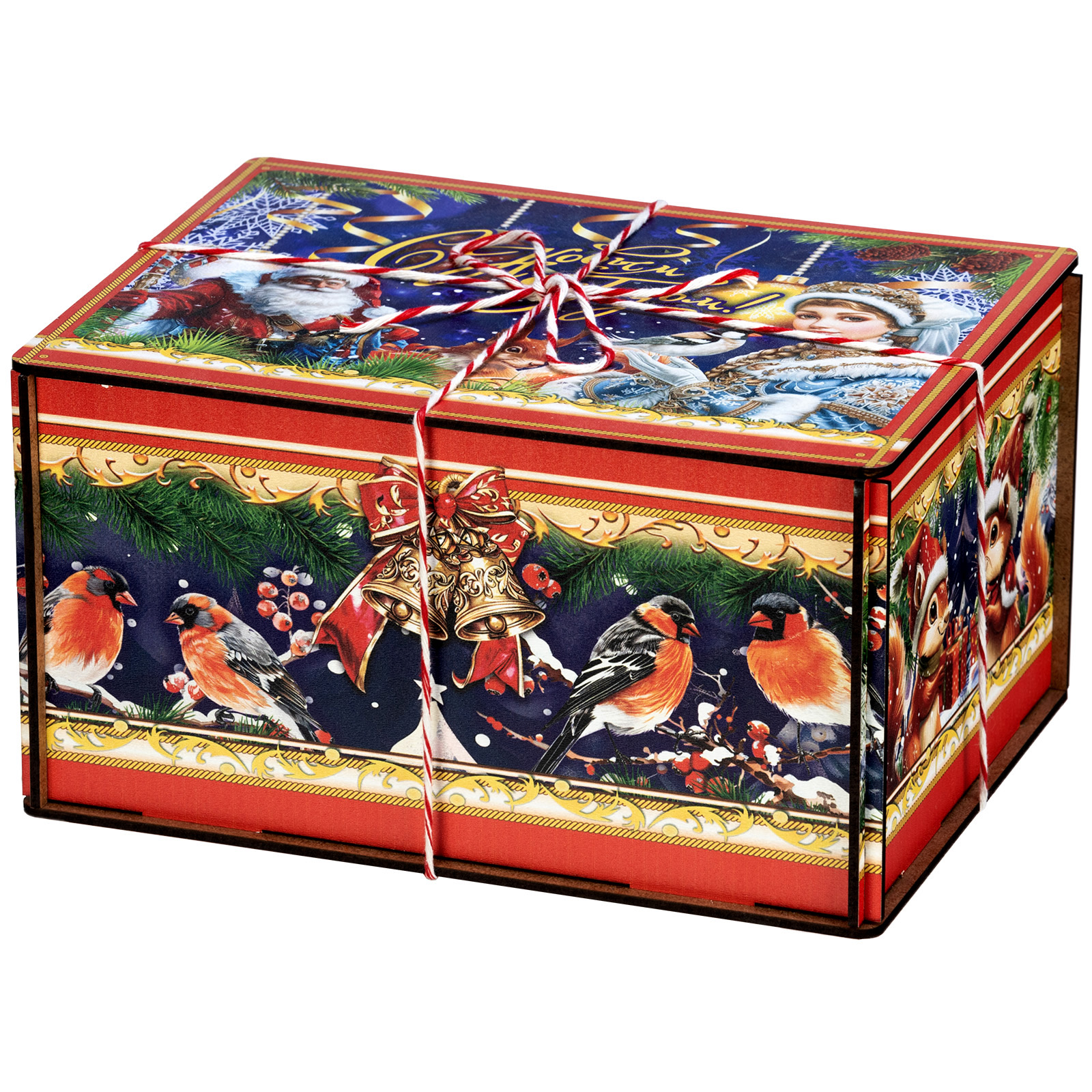 “Мелодия зимы” - это подарочный набор в деревянной упаковке, который прекрасно подойдет в качестве презента для подростка или взрослого. Это небольшой деревянный ящик, пестро украшенный со всех сторон разнообразными яркими иллюстрациями. На боковых гранях нарисованы лесные обитатели, а на крышке красуется изображение главных праздничных героев: Дедушка Мороз и Снегурочки. В состав подарка входит полтора килограмма кондитерских изделий на любой вкус, а также небольшой памятный сувенир в виде символа 2026 года - очаровательной лошадки. Благодаря такому подарку воспоминания о новогоднем торжестве останутся с вами на долгие месяцы.