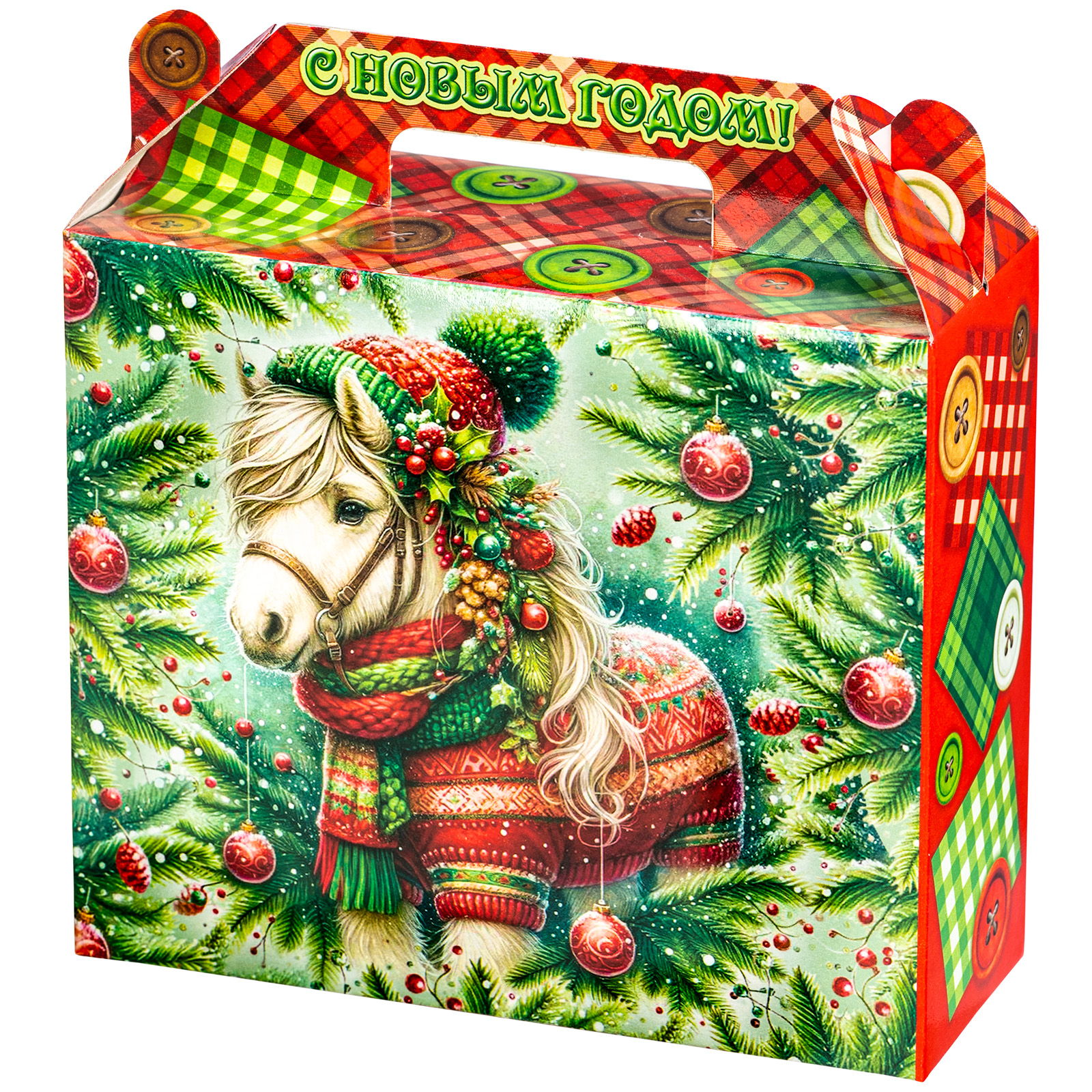 Интересный вариант новогоднего подарка – «Пуговка (Полезный состав)». Он представлен в разделе Картон. Отлично подойдет на подарок в 2026 году с символом Лошадь. Внутри такого презента находится кондитерский набор весом 500 граммов.